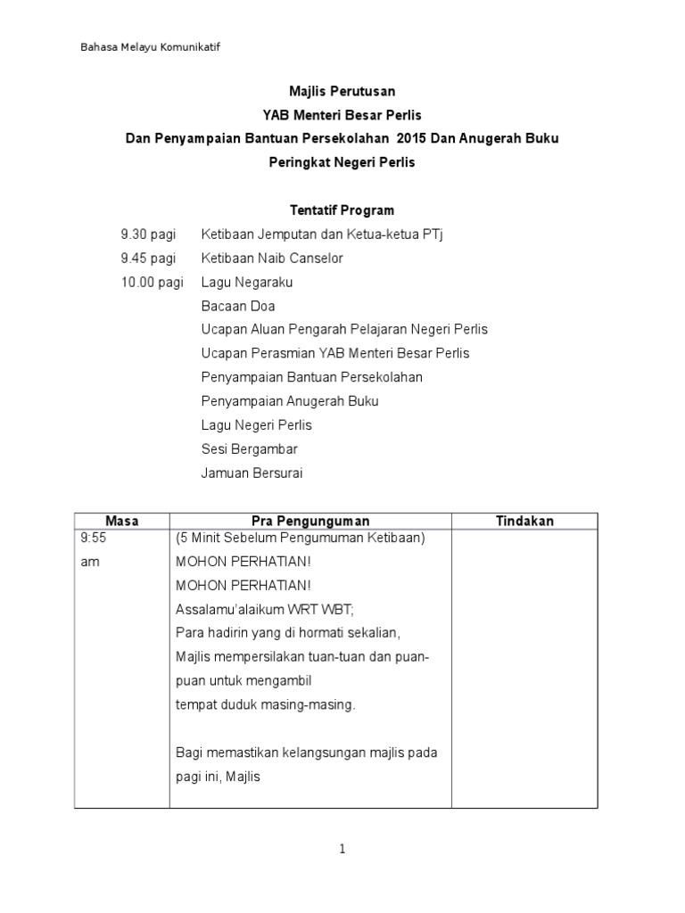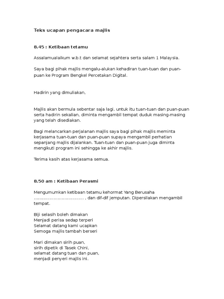 Mengumumkan ketibaan tetamu kehormat Tuan Haji Ag Arshad bin Hj Ag Kahar. Majlis aktiviti atau program tidak sempurna sekiranya tiada Pengacara Majlis. Share Embed.