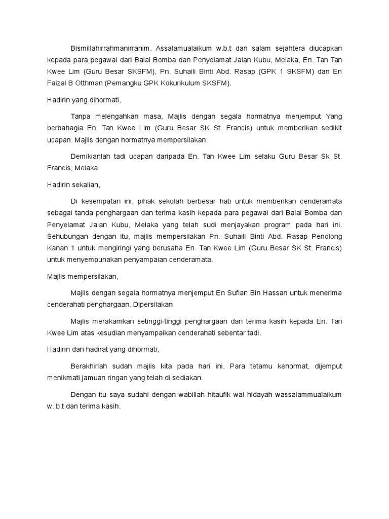 So Ill paste this script utk dikongsi bersama semua. Majlis mengucapkan terima kasih di atas ucapan beliau itu tadi. Majlis seterusnya mempersilakan Datu Matlan Datu Unjong untuk menyampaikan cenderahati kenangan kepada yang berbahagia tuan haji Saifulzaman bin Sangguldipersilakan Majlis merakamkan ribuan terima kasih atas penyampaian sijil hadiah dan cenderamata sebentar tadi.